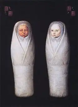 A painting known as the De Wikkelkinderen (The Swaddled Children), from 1617, is thought to represent a depiction of TTTS.[17] The drawing shows twins that appear to be identical, but one is pale, while the other is red. Analysis of the family histories of the owners of the painting suggests that the twins did not survive to adulthood, although whether that is due to TTTS is uncertain.