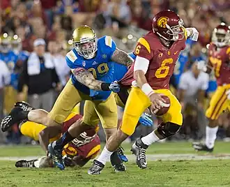 In Mora's second season, the Bruins improved to 10–3, capping the season with a victory in the 2013 Sun Bowl.[79] Behind the leadership of quarterback Brett Hundley, the Bruins came within one game of reaching the Pac-12 championship game and beat crosstown rivals USC for the second straight year.[75] In 2014, the Bruins finished 10–3 again.[80] The team beat rival USC for the third straight year[81] and won the Alamo Bowl against Kansas State.[82] Paul Perkins led the Pac-12 in rushing with 1,575 yards.[83]