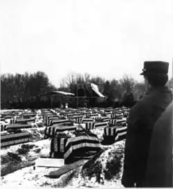 The funeral train reached Rosslyn, Virginia, on December 27. The remains were transferred to wagons, and taken to Arlington National Cemetery.[29] The funeral cortege include a cavalry unit from Fort Myer, a unit of 25 marines from the Washington Navy Yard, and a unit of bluejackets (U.S. Navy sailors) from the USS Texas.[78][79] The coffins were carried through the Sheridan Gate[80] placed under tents and an honor guard of Marines protected them overnight.[29][81]