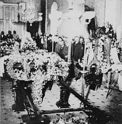 The funeral was largely the same as that used for burying the Santiago campaign's dead.[80] Protestant funeral rites were read first by Chaplain H.H. Clarke,[29] followed by Catholic rites said by Father Chidwick.[79] The sailors fired a 21-gun salute, the Marine Corps Band played a funeral dirge, taps were played by a bugler, and the reinterment ceremony ended.[78][79] More than 25,000 people watched the burial.[85] Crowds of mourners passed by the coffins during the rest of the day, laying flowers and tributes. It was not until early evening that the coffins were placed in the graves and buried.[29]