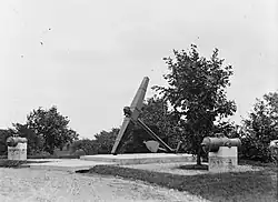 The first memorial to the Maine dead was constructed in the first six months of 1900.[92] Near the field of the Maine dead a concrete base was poured. Two Spanish mortars – taken by Admiral George Dewey from Cavite Arsenal in Manila, The Philippines, at the end of the Spanish–American War—were placed on brick piers on either side of this base.[93]