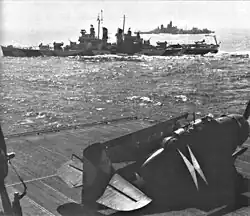 Wilkes-Barre and the rest of Cruiser Division 17 were transferred to TG 58.3, commanded by Rear Admiral Frederick C. Sherman. The unit also included the carriers Bunker Hill, Essex, and Cowpens, the battleships New Jersey and South Dakota, the large cruiser Alaska, two other cruisers, and fourteen destroyers. Over the course of operations during the next two months, the composition of the unit changed as vessels rotated out for repairs or maintenance.[6] The fleet then sortied to carry out strikes on the Japanese capital, Tokyo, beginning on 16 February and lasting for two days. These attacks were intended to distract Japanese attention from the invasion of Iwo Jima. The fleet then sailed south to support the invasion directly, launching raids on the neighboring islands of Chichi Jima and Haha Jima while en route. On 19 February, the amphibious assault on Iwo Jima began. Wilkes-Barre was detached from the carrier screen two days later to provide gunfire support to the marines fighting ashore. The ship's fire was directed by her OS2U Kingfisher floatplanes, and she was credited with destroying numerous defensive positions and ammunition dumps. Her guns also broke up an attempted counterattack from the Japanese defenders.[4]