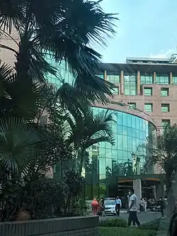 It sits on a 6-acre (2.4 ha) site on the west shore of Gulshan Lake in Dhaka.[6] By 1997, Indian architects C P Kukreja and Associates had produced a design consisting of two square blocks, the northern one smaller than the southern one because the site tapers to the north. The blocks are rotated roughly 45 degrees from the lake shore to afford lake views from two sides of each block. The two blocks, which nearly touch at one corner, are connected by an atrium. Each block has a basement and eight floors above ground.[7]