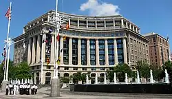 Memorial Plaza features The Lone Sailor, a statue by Stanley Bleifeld and tribute to all personnel of the sea services overlooking the Granite Sea, a map depicting the world's oceans, using an azimuthal projection centered on Washington, DC.[4] Surrounding these are two fountains honoring the personnel of the American Navy and the other navies of the world. Its southern hemisphere is surrounded by 26 bronze high reliefs commemorating events, personnel, and communities of the various sea services.