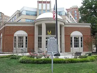 US Post Office-Arlington is a historic post office building located in the Clarendon neighborhood of Arlington, Virginia. It was designed and built in 1937, and is one of a number of post offices designed by the Office of the Supervising Architect of the Treasury Department under Louis A. Simon. The building is a one-story, pentagonal shaped brick building in the Georgian Revival style. Atop the entrance portico is a dome that rises above the buildings flat roof and is supported by four fluted limestone piers. The interior features murals by Auriel Bessemer picturing Native Americans on Analostan Island, Captain John Smith and the Native Americans, tobacco picking by the Lee mansion, Robert E. Lee receiving his Confederate commission in Richmond, a picnic at Great Falls, polo players at Fort Myer, and a contemporary harvest at an apple orchard.[3]