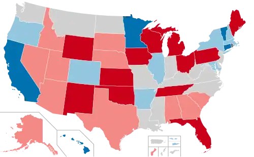 United States gubernatorial elections were held on November 2, 2010, in 37 states (with a special election in Utah) and two territories. These elections coincided with the elections for the United States Senate and the United States House of Representatives as well as other state and local elections. As in most midterm elections, the party controlling the White House lost ground.[2] Democrats took five governorships from the Republicans, while Republicans took 11 governorships from the Democrats. An independent won one governorship previously held by a Republican, while a Republican won one governorship previously held by an independent. Republicans held a majority of governorships for the first time since before the 2006 elections. One state, Louisiana, had no election for governor, but it did feature a special election for lieutenant governor.