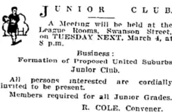 A notice was published in the Auckland Star on March 1 proposing the formation of a junior club. The convenor of the meeting was R. Cole, and it said “all persons interested are cordially invited to be present. Members required for all junior grades”. It was held at the Auckland Rugby League rooms on Swanson Street at 8pm on Tuesday, March 4.[1] R. Cole had been the honorary secretary of the Ponsonby United rugby league club the previous year.[2] In September, 1923 a “United Cricket Club” held their first annual meeting and Cole was elected president.[3] The United Suburbs club was not specifically located in any one place or representing any particular suburb. It was reported in April that they were “Western Suburbs” and along with New Lynn and Leys Institute were a new club that was affiliated with Ponsonby. It is likely that they drew on junior players from the suburbs to the west of Ponsonby.[4] The rugby league club never had an official home ground and would typically either play at the Auckland Domain or at their opponents ground.