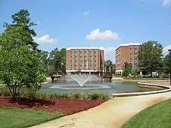 The water feature at UNCP. Belk Hall and North Hall are in the background