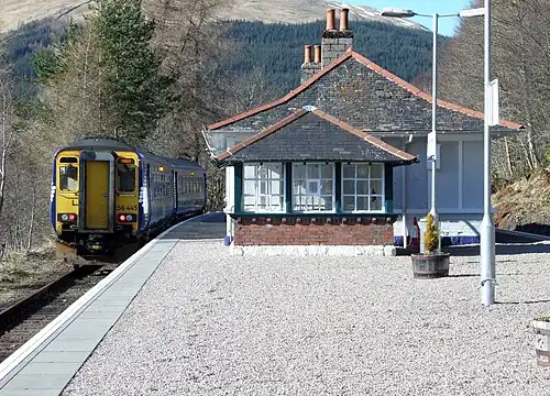 Upper Tyndrum railway station is one of two railway stations serving the small village of Tyndrum in Scotland. It is on the Fort William route of the scenic West Highland Line, between Crianlarich and Bridge of Orchy, sited 41 miles 25 chains (66.5 km) from Craigendoran Junction, near Helensburgh.[4] Services are operated by ScotRail - who manage the station - and Caledonian Sleeper.
