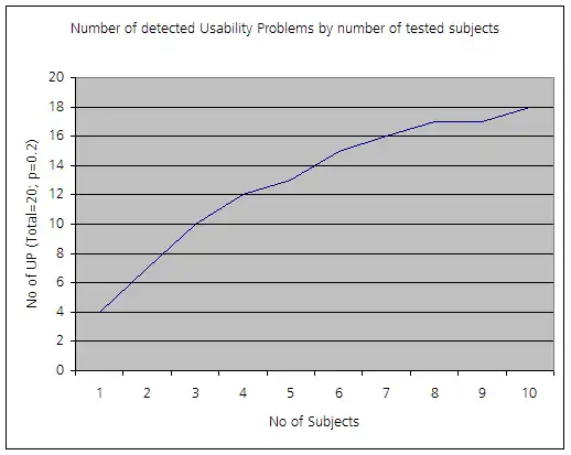 where p is the probability of one subject identifying a specific problem and n the number of subjects (or test sessions). This model shows up as an asymptotic graph towards the number of real existing problems (see figure below).