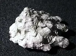 The operculum is white outside, excavated on each side of a strong granulose curved central rib, with the terminations connected by a shorter ridge curved in the opposite direction.[3]