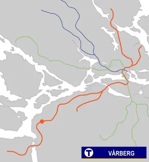 Vårberg is a station in the Stockholm metro in the neighbourhood Vårberg in Söderort, Stockholm Municipality. The station was opened on 2 December 1967 as the south terminus of an extension from Skärholmen. On 1 October 1972, the line was extended to Fittja.[2] Vårberg is part of Line 13 of the Red Line. The distance to Slussen is 12.6 km (7.8 mi).