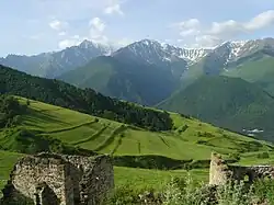 Ruins of ancient Ingush settlement, and agricultural terraces behind.