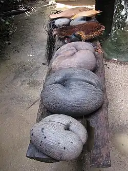 The coco de mer (Lodoicea maldivica), a monocot tree in the Arecaceae (palm family), has the largest seeds (double nut seed) of any plant in the world. Also unique to the park is its wildlife, including birds such as the rare Seychelles black parrot, mammals, crustaceans, snails, and reptiles.[2][3] There has been a determined effort to eliminate all the introduced exotic species of plants from the area but this has not been successful in eliminating coffee, pineapple, and ornamental palms thus far.[4] This forest, with its peculiar plant and animal species, is a relict from the time when the supercontinent of Gondwana was divided into smaller parts, leaving the Seychelles islands between the present day Madagascar and India.[2]