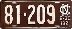 1920–21 | Embossed white serial on brown plate; white lines at top and bottom borders; "NC" monogram and "6-30 1921" at right | none | 123-456 | 1 to approximately 131-000 | |