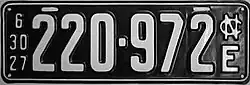 1926–27 | Embossed white serial on black plate with border line; "NC" monogram and horsepower class at right; "6 30 27" at left | none | 123-456 | 1 to approximately 421-000 | Horsepower classes were A (over 35 hp), B (31-35 hp), C (26-30 hp) and E (25 hp and under); a block of serials was assigned to each class, with E having the biggest block. This continued through 1928. |