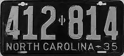 1935 | Embossed silver serial on black plate; "NORTH CAROLINA–35" at bottom | none | 123-456 | 100-001 to approximately 518-000 | |