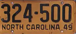 1947 | Embossed black serial on golden yellow plate; "NORTH CAROLINA 47" at top | none | 123-456 | 100-001 to approximately 682-000 | Serials 800-001 through 999-999 reserved for trucks and farm vehicles; this practice continued through 1949.[4] |