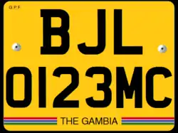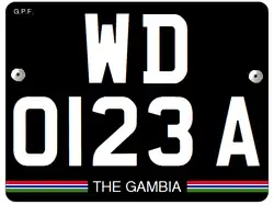 Rear Plate: 27x20 cm Black on yellow Bottom strip in Gambian Flag Text in the center bottom, saying The Gambia |