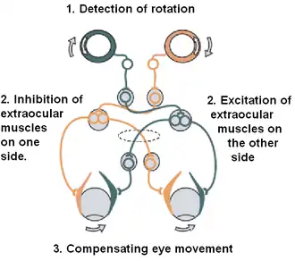This reflex, combined with the push-pull principle described above, forms the physiological basis of the Rapid head impulse test or Halmagyi-Curthoys-test, in which the head is rapidly and forcefully moved to the side while observing whether the eyes keep looking in the same direction.[2]