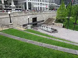 features a rectangular fountain basin and stone wall inscribed with the names of those who died during the Vietnam War. According to the Smithsonian Institution, which surveyed the monument as part of its "Save Outdoor Sculpture!" program: "This memorial is dedicated to veterans from all branches of the armed services who served in Vietnam. It replaces the former Vietnam Memorial located on Wacker Drive that was dedicated on November 11, 1982. The inscribed stones from that memorial have been incorporated into the plaza of this memorial."[1]