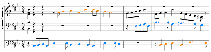 Example 2. Opening bars of the second fugue of Prelude and Fugue in E major. This is the manner in which Lübeck almost always treats countersubjects. The subject is highlighted in blue, the countersubject in orange.