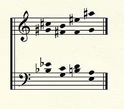 For example, Messiaen has written that "The 'Theme of Chords' is heard throughout, fragmented, concentrated, surrounded with resonances, combined with itself, modified in both rhythm and register, transformed, transmuted in all sorts of ways: it is a complex of sounds intended for perpetual variation, pre-existing in the abstract like a series, but quite concrete and quite easily recognizable through its colours: a steely grey-blue shot through with red and bright orange, a mauve violet spotted with leather-brown and encircled by bluish-purple."[3]