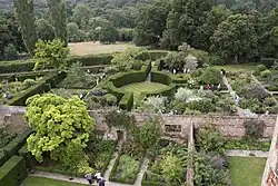 In 1930 the family acquired and moved to Sissinghurst Castle, near Cranbrook, Kent.[31] It had once been owned by Vita's ancestors. This gave it a dynastic attraction as she was excluded from inheriting Knole and a title.[1] Sissinghurst was an Elizabethan ruin and the creation of the gardens would be a joint labour of love that would last many decades, first entailing years of clearing debris from the land. Nicolson provided the architectural structure, with strong classical lines, which would frame his wife's innovative informal planting schemes. She created a new and experimental system of enclosures or rooms, such as the White Garden, Rose Garden, Orchard, Cottage Garden and Nuttery. She also innovated single colour-themed gardens and design principles orientating the visitors' experience to discovery and exploration. Her first garden at Long Barn (Kent, 1915–1930) was experimental, a place of learning by trial and error and she carried over her ideas and projects to Sissinghurst, using her hard won experience.[31] Sissinghurst was first opened to the public in 1938.
