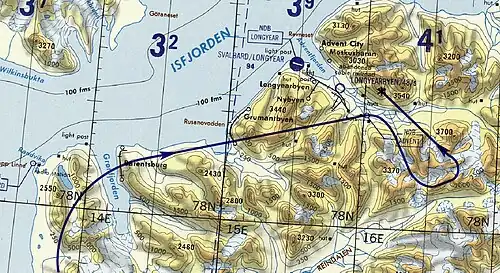 At 08:17:08 UTC, the crew started the inbound turn; however, the lateral deviation from the outbound magnetic course 155° was 3.7 km (2.3 mi; 2.0 nmi) to the left and combined with tailwind, caused airplane to pass through the localizer and roll out of turn to the right of localizer centerline. At 08:17:57 UTC, the navigator said "Ah, abeam eight miles 2801 inbound", to which AFIS replied two seconds later "Correct". This was the last radio communication between the crew and Longyear. At 08:18:30 UTC, the piloting pilot turned off the autopilot pitch channel.[1]: 9  For the rest of the flight, the plane continued with autopilot only in roll.[1]: 10