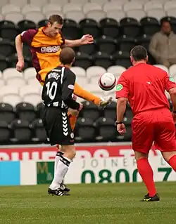 Motherwell player Brian McLean (in amber) volleys the ball in a match against St Mirren.