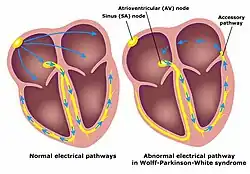 Wolff–Parkinson–White syndrome (WPWS) is a disorder due to a specific type of problem with the electrical system of the heart involving an accessory pathway able to conduct electrical current between the atria and the ventricles, thus bypassing the atrioventricular node.[2][3] About 60% of people with the electrical problem develop symptoms,[5] which may include an abnormally fast heartbeat, palpitations, shortness of breath, lightheadedness, or syncope.[1] Rarely, cardiac arrest may occur.[1] The most common type of arrhythmia (abnormal heart rate) associated with WPWS is paroxysmal supraventricular tachycardia.[1]