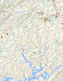 Wahoo Creek - Wahoo Creek rises just inside White County, less than 1 mile south-southwest of the intersection between State Route 115 and the northern terminus of State Route 284, on the northern face of the northernmost of two ridges in the area. The creek runs north, then west, and turns southwest around the western edge of the ridge after about 1 mile, crosses into Lumpkin County, and continues in a southwesterly direction for approximately 2.8 miles, until it crosses State Route 52, where it turns to the south. Wahoo Creek continues running south for approximately 6 miles, before it is joined by Bull Creek from the west, which is a parallel system of 4 small streams draining the area east of State Route 115 in Lumpkin County, and west of the Wahoo Creek drainage basin. Wahoo Creek continues south for another 2.5 miles, and flows into Lake Lanier together with Gin Branch at the Wahoo Creek arm of the lake, the northern arm of Lake Lanier, just east of Murryaville. The creek is approximately 13.13 miles (21.13 km) long.[5]
