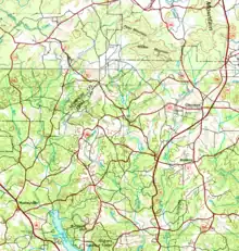 The Wahoo Creek-Little River watershed is designated by the United States Geological Survey as watershed HUC 0313000104, and drains an area of approximately 87 square miles.[4] It extends from southwestern White County, where State Route 115 west of State Route 284 forms the northern border of the basin, counter-clockwise to Old Dahlonega Highway in the west, down through Murrayville and Price, then southeast along State Route 136 and then State Route 60 to the northern end of Thompson Bridge. From Thompson Bridge, the watershed extends east along Thompson Mill Road to U.S. Route 129, which the basin boundary follows northeast until US 129 turns north, while the boundary keeps heading northeast to follow State Route 284 north to Clermont, and completes the loop when it meets State Route 115.[4]