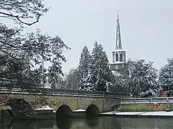 The Church of St Mary-le-More is located in a prominent position in the town square behind Wallingford Town Hall. The church appears in records from 1077, when the advowson belonged to St Alban's Abbey.[16] The west bell tower was originally 12th century, but its upper stages were rebuilt in a Perpendicular Gothic style[16] out of the stone from Wallingford Castle when it was demolished by Oliver Cromwell after the Civil War. The nave and aisle were built in the 13th and 14th century, and the chancel was built later. However, all were rebuilt in 1854 to designs by the Gothic Revival architect David Brandon.[9]