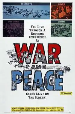 War and Peace (Italian: Guerra e pace) is a 1956 epic historical drama film based on Leo Tolstoy's 1869 novel of the same name. It is directed and co-written by King Vidor and produced by Dino De Laurentiis and Carlo Ponti for Paramount Pictures. The film stars Audrey Hepburn as Natasha, Henry Fonda as Pierre, and Mel Ferrer as Andrei, along with Vittorio Gassman, Herbert Lom, Oskar Homolka, Anita Ekberg in one of her first breakthrough roles, Helmut Dantine, Barry Jones, Anna Maria Ferrero, Milly Vitale and Jeremy Brett. The musical score was composed by Nino Rota and conducted by Franco Ferrara.