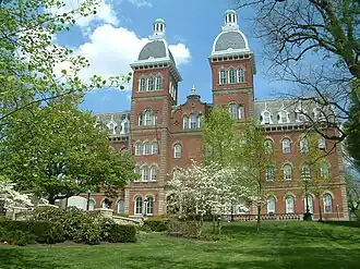 The oldest surviving building is McMillan Hall, which dates to 1793 and is the oldest college building west of the Allegheny Mountains.[46] The main academic building is Old Main, which is topped with two prominent towers.[47] The Old Gym houses a modern exercise facility.[48] McIlvaine Hall, which was originally home to a female seminary, was demolished in 2008 and replaced by the Swanson Science Center.[49][50] Davis Memorial Hall was once a dormitory and private house.[51] The Lazear Chemistry Hall, and the Dieter-Porter Life Sciences Building all cater to the scientific curriculum.[36] The Burnett Center and its sister building, the Technology Center, were built in the late 1990s and early 2000s.[52][53]
