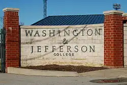 The campus of Washington & Jefferson College is located in the city of Washington and the East Washington Borough, small-town communities about 30 miles (48 km) south of Pittsburgh.[40][41] The 60-acre (24 ha) campus is home to more than 40 academic, administrative, recreational, and residential buildings.[40] The northern edge of campus is bound by East Walnut Street, the western edge by South College Street, the southern edge by East Maiden Street, and the eastern edge by South Wade.[42] Portions of the campus extend into the East Washington Historic District.[43] Four historic gates mark four traditional entrances to campus at East Maiden Street, Wheeling Street, South College Street, and Beau Street.[44] In 1947, the Pennsylvania Historical and Museum Commission installed a historical marker noting the historic importance of the college.[45]