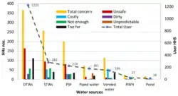 People's concerns regarding different sources of drinking water in Southwest Coastal Bangladesh (DTWS stands for deep tube wells, STWS is shallow tube wells, HH is household, PSF is pond sand filter, RWH is rainwater harvesting).[28]