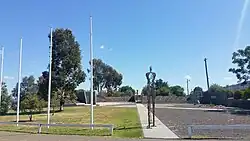 In 1989, a committee led by Chris Holley – a former porter, shunter, guard and controller, strongly supported by a band of fellow retired railmen such as veteran yard master Les Brown – vowed that Werris Creek would not die. Their determination led to the acceptance of a plan envisaged by Dr Stuart Sharp, of the former NSW State Rail Authority Heritage Unit, involving creation of an Australian Railway Monument. The 3-metre (9.8 ft) high stainless steel sculptures this comprises depict a fettler, shunter and firemen, a signalman, gatekeeper and flag lady. The sculptor is Dominique Sutton who also worked on Sydney Olympic Park. They look down on a specially landscaped amphitheatre beside the railway station. Memorial walls complement the amphitheatre and contain more than 2,400 names of all those railway people who had lost their lives either at work or from injuries received at work.[1][3]