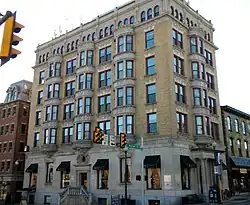 West Chester Public Library is the community library.[54] The library had its roots in a subscription library founded in 1815 by William Darlington and David Townsend and dissolved in 1831. Incorporated in 1872, the library rented rooms to house its collections until March 1888, when the library opened at its current location at 415 North Church Street, on land donated by Hannah M. Darlington, who also donated the Tiffany-style stained-glass windows. The architect was T. Roney Williamson.[55] The library became permanently free and open to the public in 1905, coming under the authority of the borough council and school board. The library built an extension for a children's library in 1916. The West Chester Garden Club landscaped the grounds and erected a wall around the courtyard in 1934.[56]