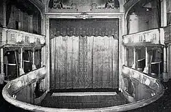 Original interior of Savoy Theatre in 1881, the year it was fitted with the incandescent light bulb developed by Sir Joseph Swan to become the first public building in the world to be lit entirely by electricity.[28][29]