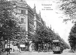 The outbreak of the World War I initially brought little change. On August 6, 1914, the company discontinued Line M, which had been established shortly before. The construction of Entlastungsstrecke der Hochbahn between the stations Gleisdreieck and Nollendorfplatz necessitated the removal of the streetcar from Motzstraße and Kurfürstenstraße; lines A, BH and BS were rerouted via Bülowstraße. A few months later, the WBV discontinued the BH line and shortened the BS line to the Potsdamer Platz - Roseneck via Schmargendorf route; in the course of 1917, it was again designated line B.[6] From November 15, 1916, Line L ran via Lützowplatz instead of via Lichtensteinallee. Line G was withdrawn from Roseneck to the Wilmersdorf municipal cemetery on February 15, 1917, with line 57 of the GBS taking over service to Hohenzollerndamm.[5]