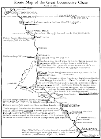 At Adairsville, Fuller got the locomotive Texas and chased the General. While all of this was happening, Andrews' Raiders were cutting the telegraph wires so no transmissions could go through to Chattanooga. With the Texas chasing the General in reverse, the chase went through Dalton, Georgia, and Tunnel Hill, Georgia.