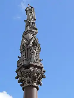 The memorial comprises a tall pink Peterhead granite pillar, carved with a ring of blank shields about halfway up, topped by a Portland stone capital and statues. The statue atop the column was carved by J. R. Clayton and depict Saint George slaying the dragon, below which is a lantern tier with four Gothic niches, housing statues of Saint Edward the Confessor (facing east), Henry III (west), Elizabeth I (south) and Queen Victoria (north), all carved by J. Birnie Philip, above a highly decorated floral capital. The pillar stands on a stone base with four granite pilasters, each topped by a stone statue of a lion, resting on three octagonal steps, ringed by iron railings. The base stands about 4.3 m (14 ft) high, with the column and statues another 18.6 m (61 ft) on top.