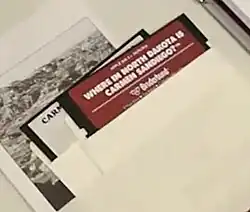 The first day the game had retail distribution was March 18, 1989, in the Dakota Square Mall, where members of the NDDC demonstrated the software.[26] At the time of its release, Broderbund was the third largest developer of commercial computer software in the United States, and its Carmen Sandiego software was especially popular both in schools and with the general public.[11] World was used throughout Minot's 6th grade classes while U.S.A. was used in their 5th grade classes; the games were both popular in Fargo schools. Where in North Dakota is Carmen Sandiego? was targeted at fourth graders as the team believed this was the year when students began learning about their state.[11] However, the teacher's guide suggested the game was suitable for students in grades four to twelve, for use either by an individual, a small group, or the entire class.[13] Schools were encouraged to allow students to play the game before and after school, or when they completed their school work early.[11] The game was not intended to be a replacement for the North Dakotan curriculum. Nansen saw it as an "enrichment activity"[5] and a "motivating instructional tool" instead,[13] merely one of many ways to get students interested in North Dakota.[5] To promote the game, Nansen conducted seminars in schools across the state, encouraging teachers to incorporate the game, as well as other North Dakotan database games, into their curricula.[1][12] North Dakota public school districts interested in the program were encouraged to call social studies director of the North Dakota Department of Public Instruction, Curt Eriksmoen,[24] and before using it had to send at least one educator to one of Nansen's seminars.[1] North Dakota's Department of Public Instruction would ship copies to qualifying schools across the state.[1] Meanwhile, the public could order the game from Broderbund Software-Direct at a recommended retail price of $34.95, while educators could order teacher's guides for $10.[1] There is no proof the game was ever officially sold through retail stores (although one complimentary retail copy was sent to the NDDC for their work on the project).[4] The game was never officially published; only 10 prototype retail copies were ever produced, which were all mailed to educators involved in the project.[7]