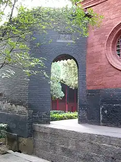 In addition, the 'Cool and Clear Terrace' known as the 'Qingliang Terrace' is behind the main hall, the place where the original sutras were translated.[1][6] This terrace is amidst bamboo forest of old pine trees and has halls which are interconnected. Four sides of the terrace are piled with green bricks. The central building of the terrace is the Vairocana Pavilion, which was originally constructed during the Han dynasty. The present building dates back to the Ming dynasty and was built with a xieshan style roof with double eaves. The pavilion principally enshrines statues of Vairocana Buddha and the Bodhisattvas Manjushri and Samantabhadra. In addition, a total of 5,050 wood-carved Buddha statues, made with incense ash, are enshrined on both sides of the pavilion. The terrace also has the Kunlu Pavilion with halls on its east and west that house the statues of the two eminent monks, She Moteng and Zhu Falan. They were buried inside the temple gate after they died here; the Bell Tower and the Drum Tower, in front of their tombs, were once prominent sights of Luo Yang City.[6]