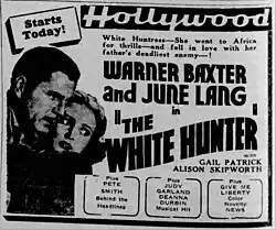 White Hunter is a 1936 American adventure film directed by Irving Cummings and written by Sam Duncan, Kenneth Earl and Georg Wilhelm Pabst. The film stars Warner Baxter, June Lang, Gail Patrick, Alison Skipworth, Wilfrid Lawson and George Hassell. The film was released on November 25, 1936, by 20th Century Fox.[1][2][3]