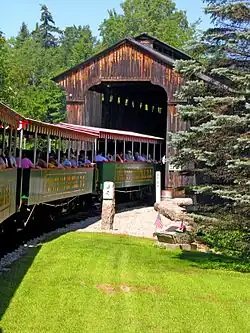 The railroad includes a 1904 Howe truss covered bridge that was originally located in East Montpelier, Vermont, where it spanned the Winooski River and carried trains for the Montpelier and Barre Railroad.[6] The bridge was purchased by the owners of Clark's Trading Post and dismantled in 1964,[7] then moved and reassembled to span the Pemigewasset River near the Trading Post.[8] During one weekend in September, Railroad Days are celebrated, with extra trains and special consists. That yearly event had stopped in 2014 and now operates every 5–10 years.