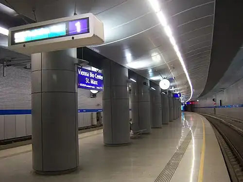 Wien St.Marx, also referred to as Vienna Bio Center/St. Marx, is a railway station serving Landstraße, the third district of Vienna.[1] It was rebuilt in 2002 as part of a project to relocate the Aspangbahn to an underground tunnel.[2]
