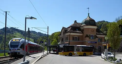The "wedge" station of Lichtensteig, on the left is the track of the SOB with a Stadler FLIRT (RABe 526), in the middle of the post bus to Krinau. The track of the Toggenburg Railway runs behind the station building.